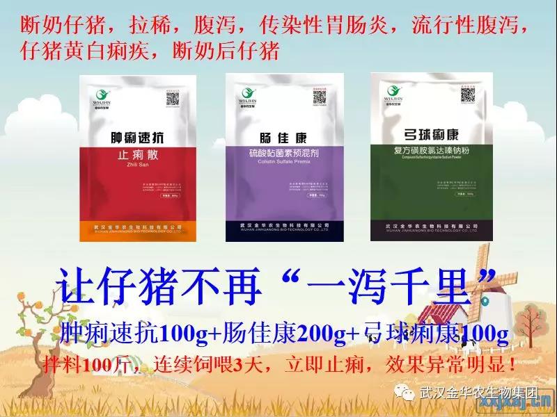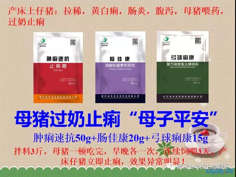 產(chǎn)床上仔豬:拉稀,黃白痢,腸炎,腹瀉,母豬喂藥,過奶止?。耗[痢速抗50g+腸佳康20g+弓球痢康15g,拌料3斤,母豬一頓吃完,早晚各一次,連續(xù)飼喂3天,產(chǎn)床仔豬立即止痢,效果異常明顯!