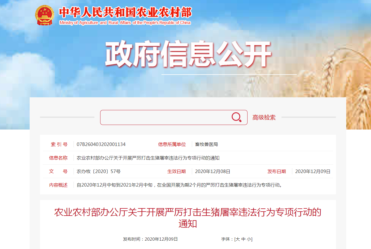 今年以來,各地通過開展農(nóng)產(chǎn)品質(zhì)量安全專項整治“利劍”行動,查辦了一批屠宰環(huán)節(jié)違法案件、搗毀了一批私屠濫宰窩點、銷毀了一批問題產(chǎn)品,有力支持了全國非洲豬瘟防控和生豬生產(chǎn)恢復(fù),有效保障了生豬產(chǎn)品質(zhì)量安全。隨著冬季,特別是元旦春節(jié)消費旺季的到來,豬肉產(chǎn)品消費將進入高峰期,從近期各地案件查辦情況看,私屠濫宰等屠宰環(huán)節(jié)違法案件呈上升趨勢。為切實維護生豬屠宰行業(yè)秩序,保證生豬產(chǎn)品質(zhì)量安全,保障節(jié)日期間豬肉消費安全和人民身體健康,農(nóng)業(yè)農(nóng)村部決定自2020年12月中旬到2021年2月中旬,在全國開展為期2個月的嚴厲打擊生豬屠宰違法行為專項行動?,F(xiàn)就有關(guān)事項通知如下。