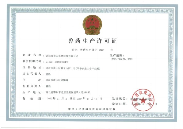 武漢金華農獸藥生產許可證號:獸藥生產證字17067號
