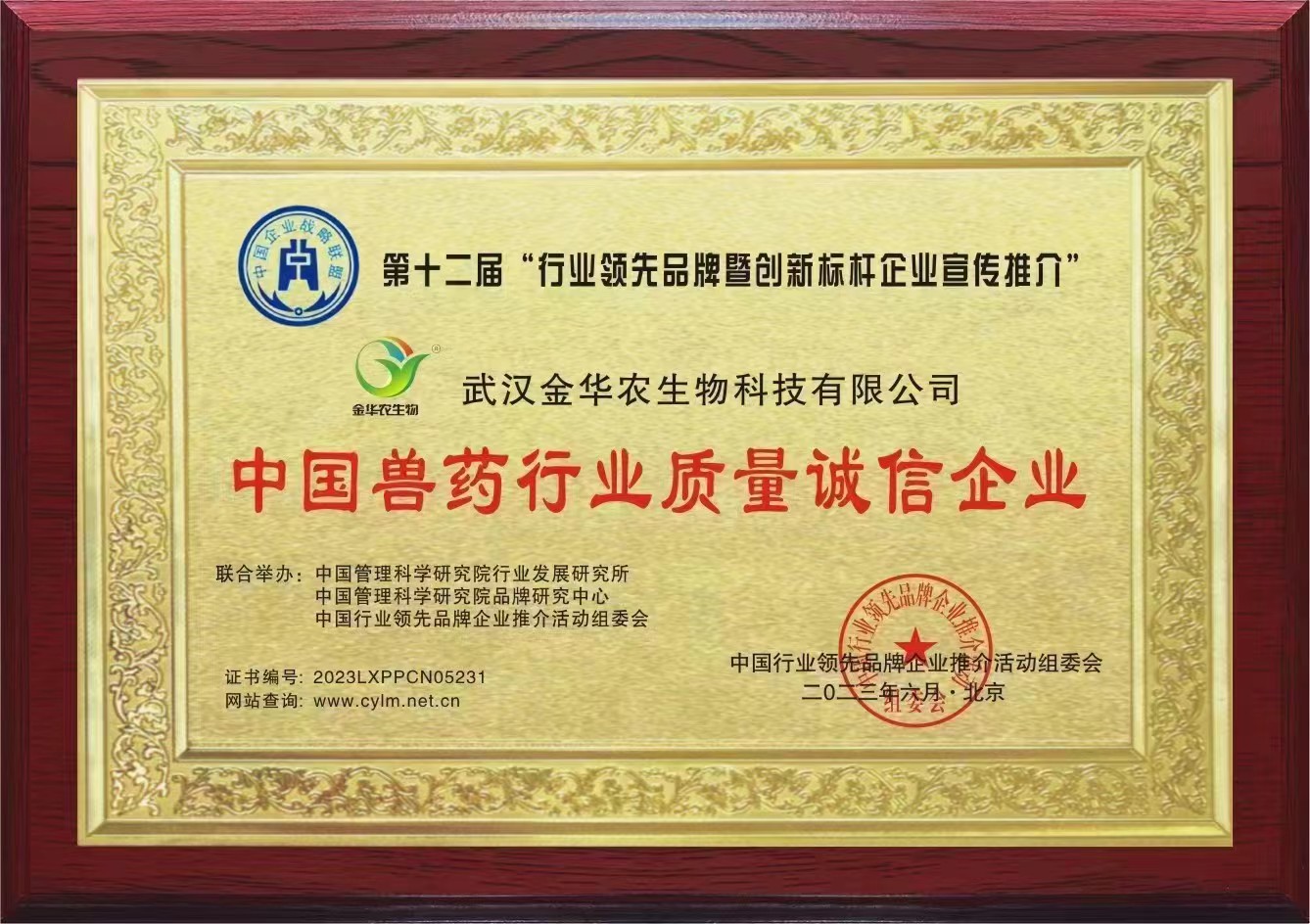 卯兔年未過半,武漢金華農(nóng)已迎來諸多利好消息。公司業(yè)績突飛猛進(jìn),銷量翻番;公司獲得省農(nóng)業(yè)農(nóng)村廳第一批新版GMP獸藥文號、飼料添加劑45個新品種批號;公司憑借專業(yè)技術(shù)、創(chuàng)新發(fā)展、高效服務(wù),被國家信用平臺、品牌強(qiáng)國計(jì)劃評選為“獸藥飼料添加劑行業(yè)典范企業(yè)”。近日,公司又在中國科學(xué)研究院組織的全國自主品牌研發(fā)、科研創(chuàng)新產(chǎn)品、質(zhì)量品控管理、高校產(chǎn)學(xué)研基地建設(shè)的評選活動中,經(jīng)嚴(yán)格篩選,層層選拔,考核評比,監(jiān)督審查,被中國科學(xué)研究院組委會授予“中國獸藥行業(yè)質(zhì)量誠信企業(yè)”榮譽(yù)。