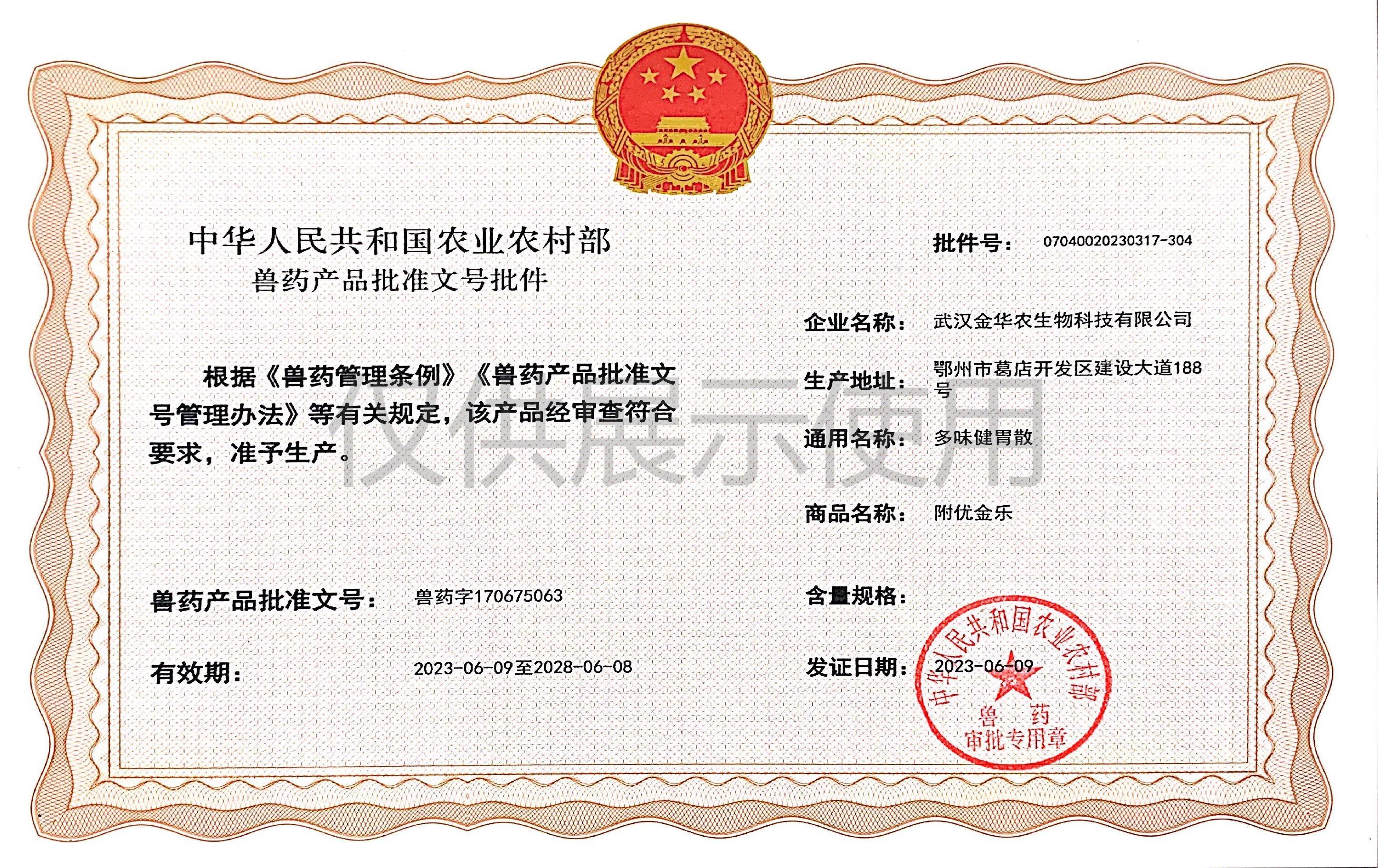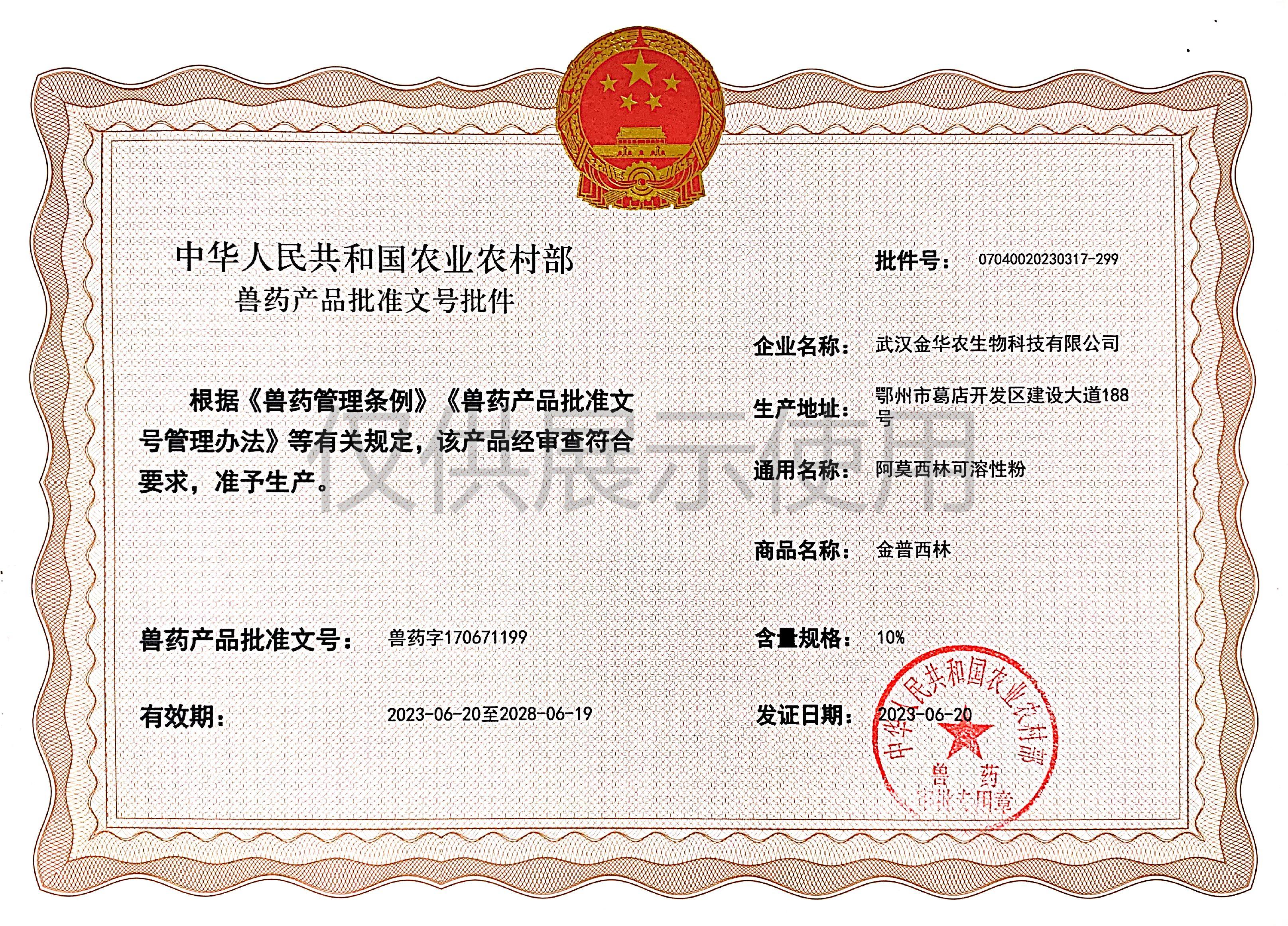 根據(jù)《獸藥管理?xiàng)l例》和《獸藥產(chǎn)品批準(zhǔn)文號(hào)管理辦法》的規(guī)定,經(jīng)農(nóng)業(yè)農(nóng)村部審查,準(zhǔn)予核發(fā)武漢金華農(nóng)生物科技有限公司(以下簡(jiǎn)稱“武漢金華農(nóng)生物”)國(guó)家新版GMP6種獸藥相關(guān)產(chǎn)品批準(zhǔn)文號(hào),這是繼今年5月我司獲得第一批新版GMP獸藥批準(zhǔn)文號(hào)后再一次獲得獸藥產(chǎn)品批準(zhǔn)文號(hào)。