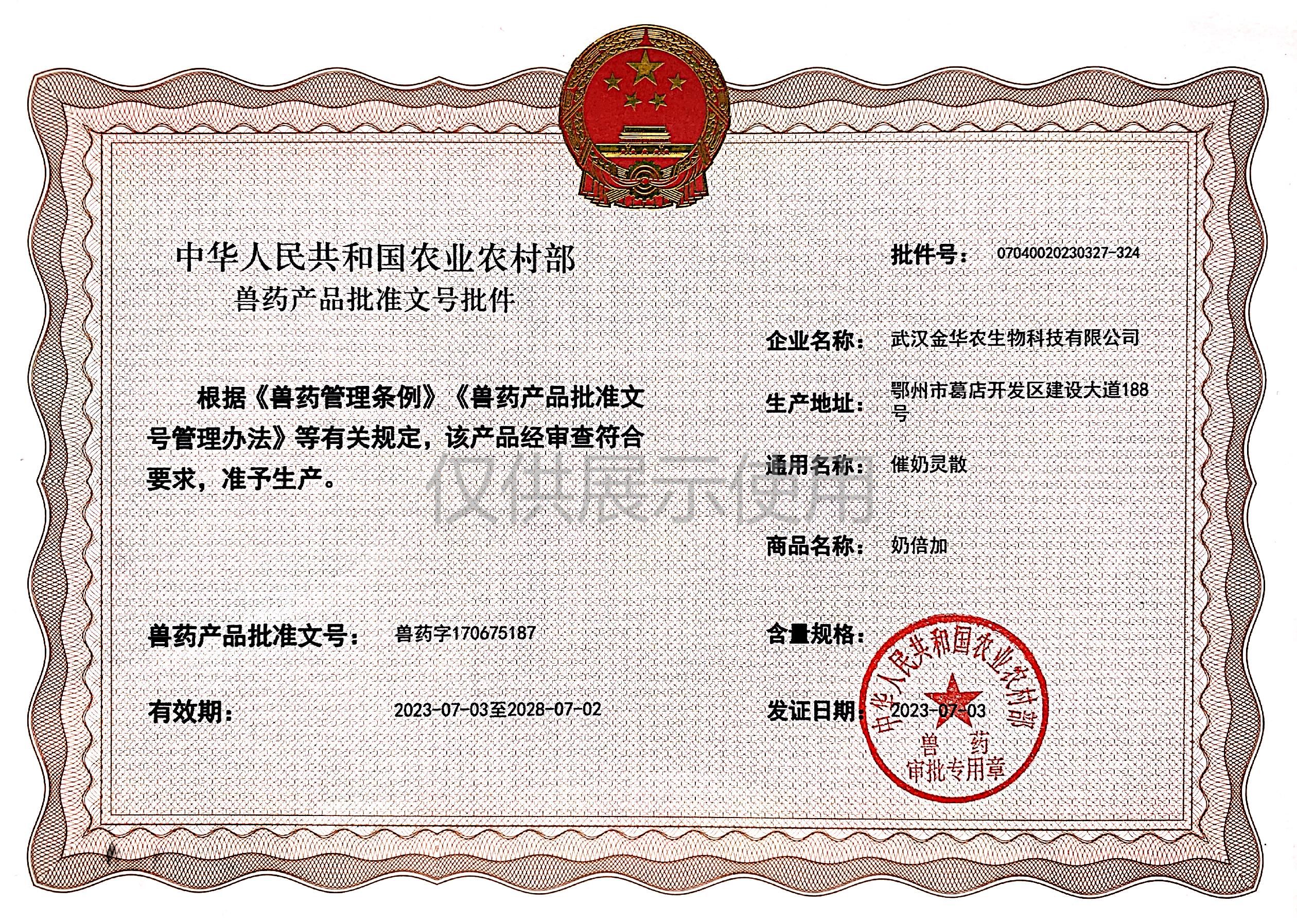 根據(jù)《獸藥管理條例》和《獸藥產(chǎn)品批準文號管理辦法》的規(guī)定,經(jīng)農(nóng)業(yè)農(nóng)村部審查,準予核發(fā)武漢金華農(nóng)生物科技有限公司(以下簡稱“武漢金華農(nóng)生物”)國家新版GMP9種獸藥相關(guān)產(chǎn)品批準文號,這是今年獲取的第三批獸藥產(chǎn)品批準文號,截至目前,我司已獲得農(nóng)業(yè)農(nóng)村部頒發(fā)的新版GMP獸藥文號20個。