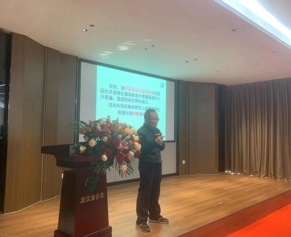 圖二為:武漢金華農(nóng)研發(fā)導(dǎo)師、華中農(nóng)業(yè)大學(xué)動(dòng)醫(yī)專家、博士生導(dǎo)師姚寶安教授專題培訓(xùn)中