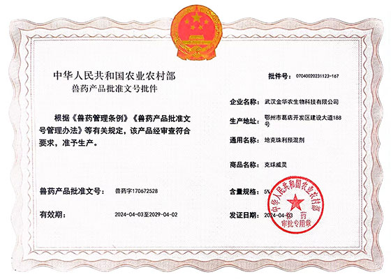 根據(jù)《獸藥管理條例》和《獸藥產(chǎn)品批準文號管理辦法》的規(guī)定,經(jīng)農(nóng)業(yè)農(nóng)村部審查,準予核發(fā)武漢金華農(nóng)生物科技有限公司2個新版GMP獸藥相關產(chǎn)品批準文號。