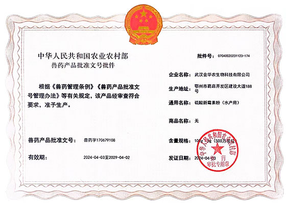 根據(jù)《獸藥管理?xiàng)l例》和《獸藥產(chǎn)品批準(zhǔn)文號(hào)管理辦法》的規(guī)定,經(jīng)農(nóng)業(yè)農(nóng)村部審查,準(zhǔn)予核發(fā)武漢金華農(nóng)生物科技有限公司3個(gè)新版GMP水產(chǎn)漁藥相關(guān)產(chǎn)品批準(zhǔn)文號(hào)。