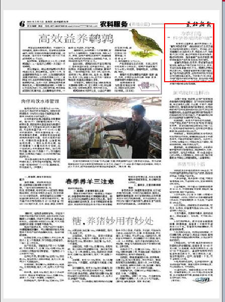 ??? 科學養(yǎng)殖致富,減少疫病發(fā)生,是廣大養(yǎng)殖戶最為關(guān)切的問題。為將農(nóng)業(yè)部、省畜牧局提出的“畜牧科技進農(nóng)家、結(jié)對幫扶”活動落到實處,金華農(nóng)生物公司今年將抽調(diào)30名技術(shù)人員,進村入戶,與養(yǎng)殖戶(養(yǎng)殖場)對接,通過開展技術(shù)咨詢與指導、贈送科技資料、提供畜禽產(chǎn)品供求信息、幫助銷售畜禽產(chǎn)品、開通畜牧疾病咨詢熱線等服務活動,助農(nóng)增收。