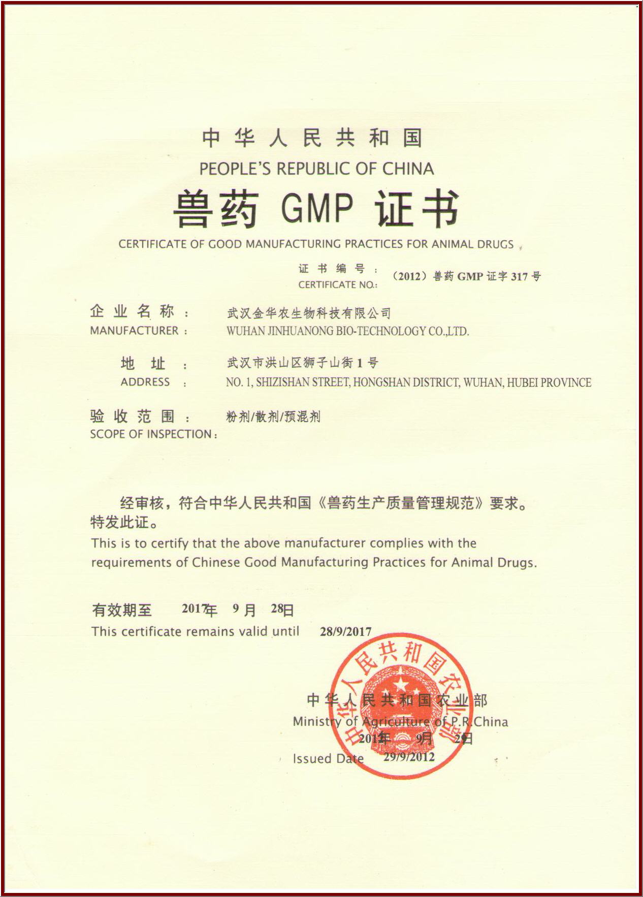??2012年9月28日、29日,武漢金華農(nóng)獲國家農(nóng)業(yè)部頒發(fā)雙證---【(2012)獸藥GMP證字317號】和獸藥生產(chǎn)許可證【(2012)獸藥生產(chǎn)證字17048號】同期到達(dá),雙喜生輝!