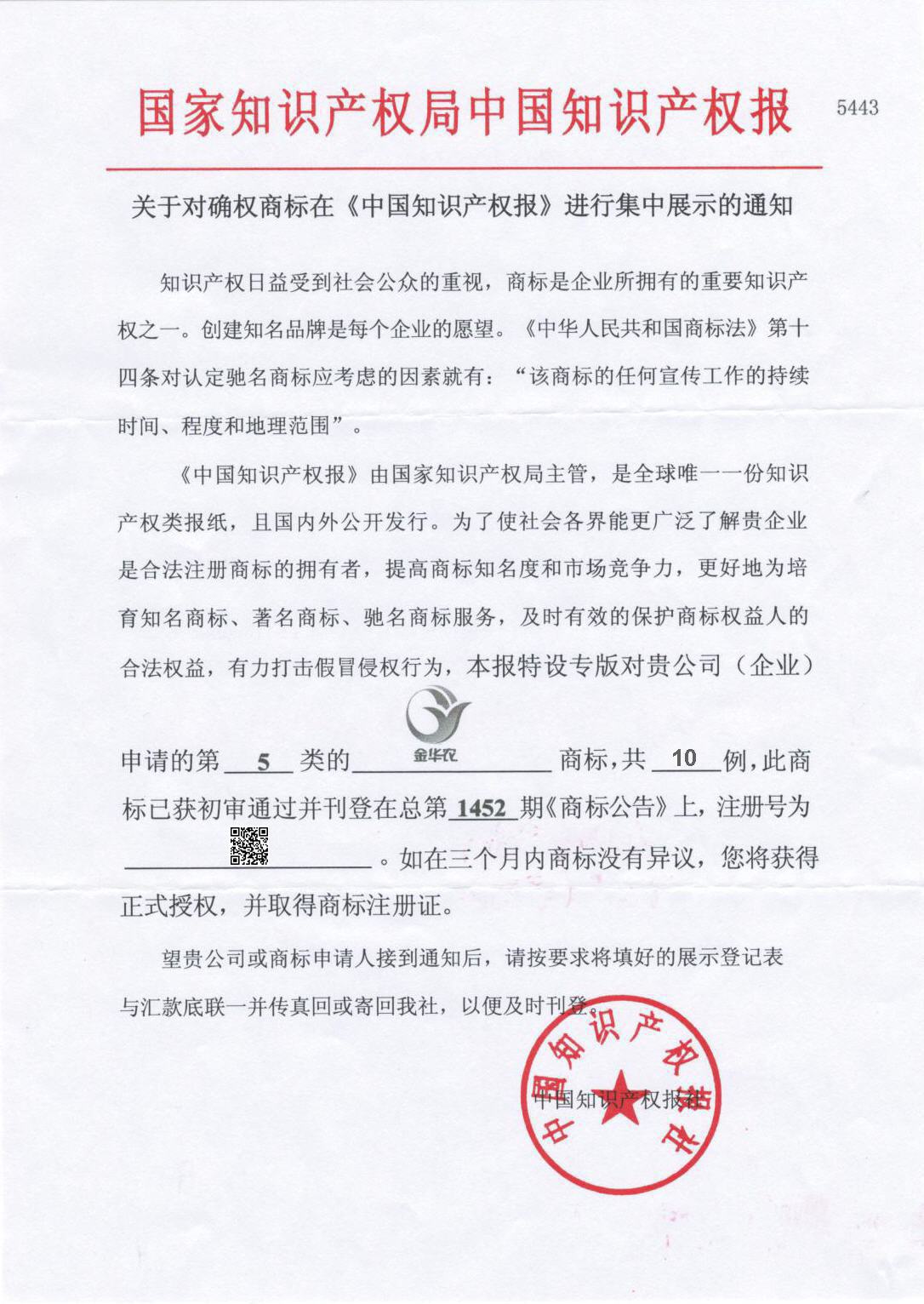 7月22日, 武漢金華農(nóng)生物喜獲國家工商總局頒發(fā)“馳名商標(biāo)”認證。經(jīng)國家知識產(chǎn)權(quán)局授權(quán),中國知識產(chǎn)權(quán)報、中國商報社聯(lián)合對武漢金華農(nóng)生物品牌戰(zhàn)略規(guī)劃、馳名商標(biāo)事項等進行專題報道。