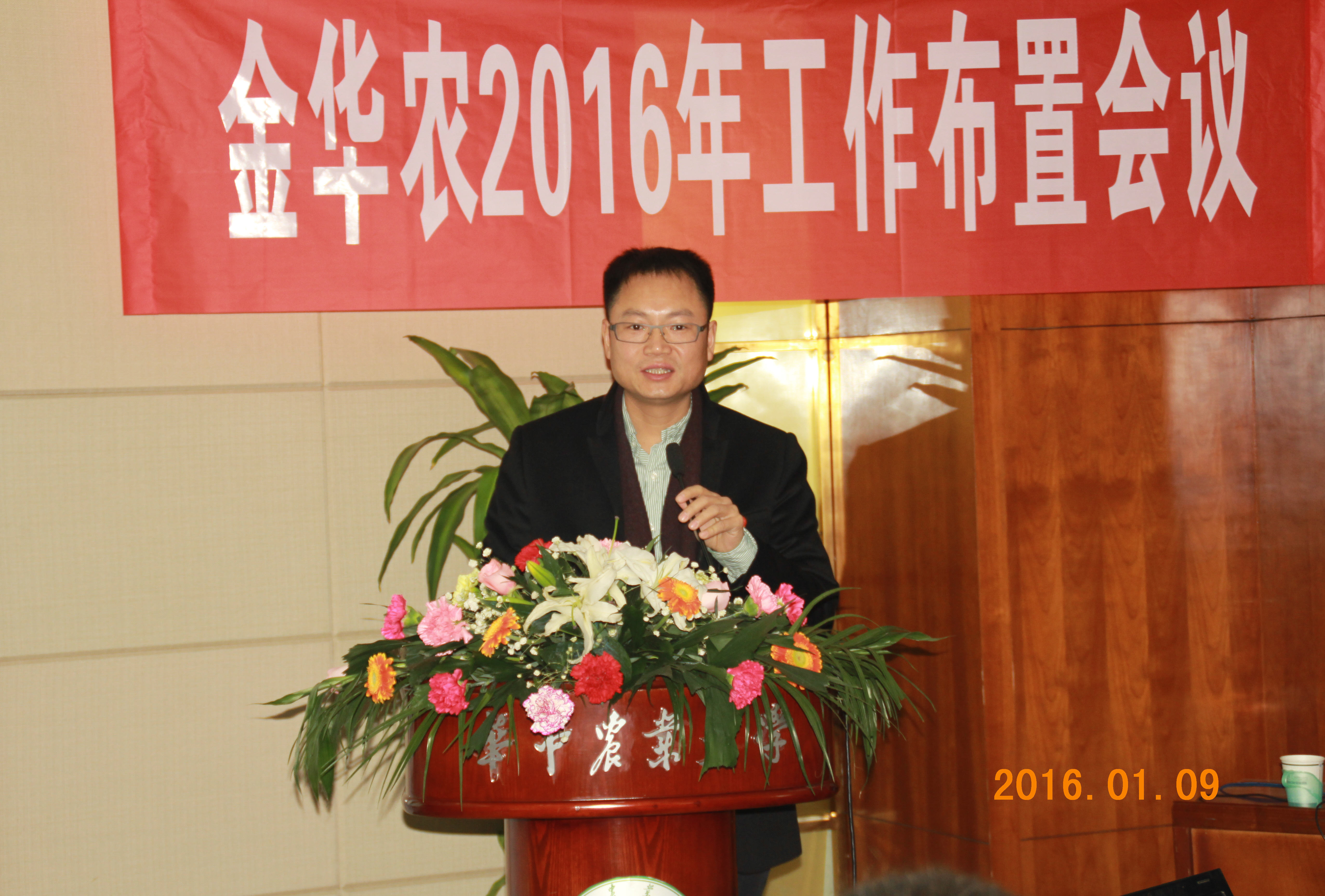 龍健飛處長致賀詞說:“肯定”、“堅守”、“拼搏”是我送給武漢金華農公司的三個關鍵詞。武漢金華農,源自華農,同時,他又服務于農業(yè)養(yǎng)殖,公司的每個元素都與“農”相關!公司的事業(yè)和成長值得肯定,只有正確認識成績,我們才能增強信心!在目前經濟增長放緩的大環(huán)境下,獸藥行業(yè)面臨洗牌重組,畜牧養(yǎng)殖業(yè)倍加艱難,對這份事業(yè),還需要企業(yè)持續(xù)的投入、需要大家的堅守!現(xiàn)在,武漢金華農,已經度過最初的草創(chuàng)期,公司發(fā)展的方向更明確,那就是富總說的:“做好藥,良心藥!打造中國動保杰出品牌”,只要我們拼搏,就一定能實現(xiàn)這個愿景!2016年,讓我們一起為金華農加油!