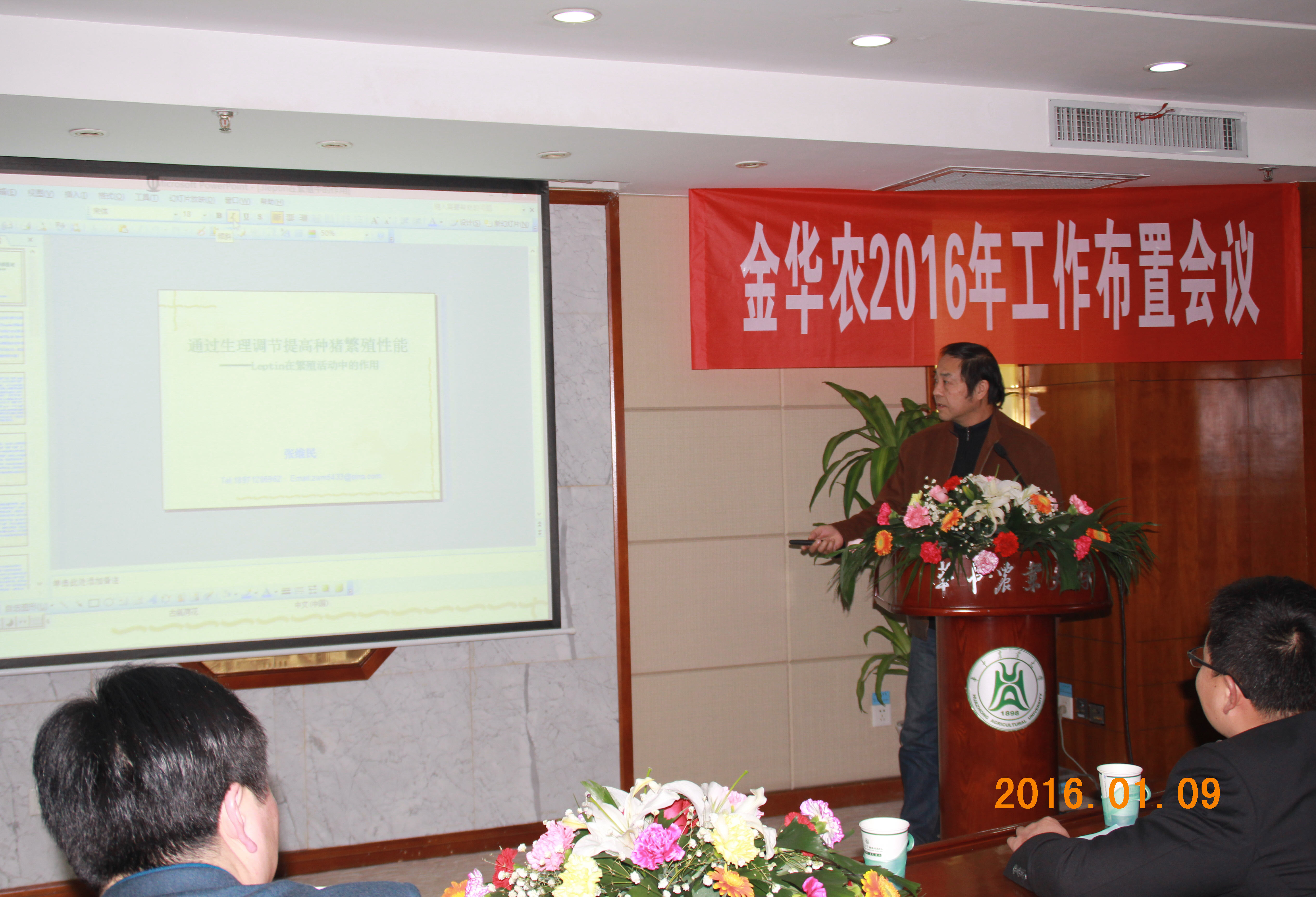 齊德生教授講課中說:我今天很高興又一次參加武漢金華農生物科技有限公司年終工作會議,其實很早金華農公司建廠飼料添加劑驗收時,我就參加專家組的驗收工作,與富總十分熟悉。希望今天的講課內容“冬季呼吸道、霉菌毒素、仔豬拉稀”都是常見疾病,能與大家分享,并且有所幫助!我感受到了金華農公司在富總的帶領下每年都有很大的變化和不一樣,與時俱進,總在科研前沿,祝福金華農公司、祝福金華農團隊,提前完成2016既定目標!